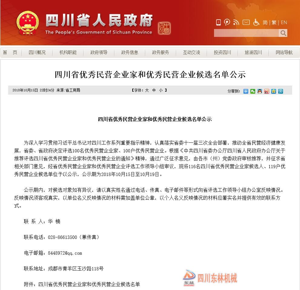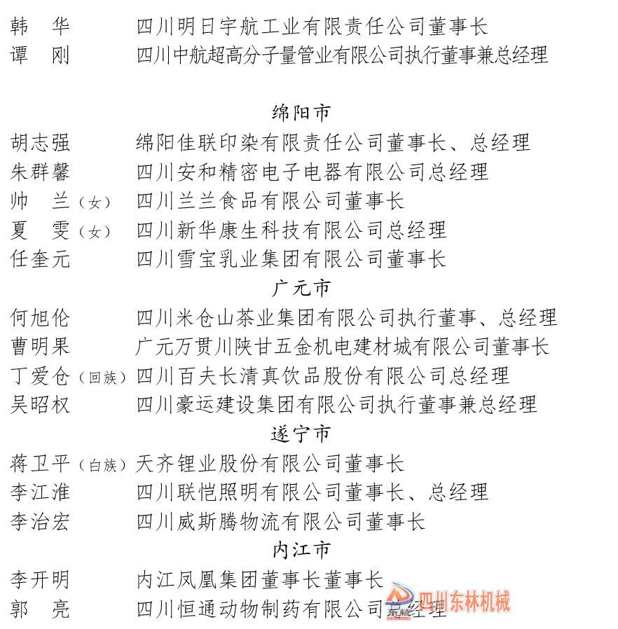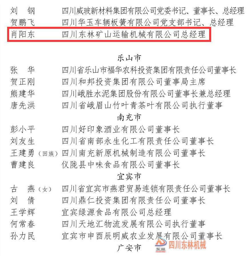 东林矿机党支部书记、总经理入围四川省优秀民营企业家