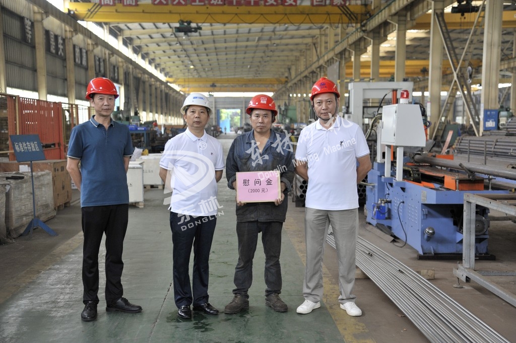 Donglin heavy industry company leaders learned that the sheet metal welding workshop front-line staff Li Liangmin's son was seriously ill in hospital treatment, due to the outbreak can not be admitted to hospital to visit, July 23 at around 10:00 am, xiao Yangdong, Secretary of the company's Party branch and general manager, and Jiang Minggang, chairman of the trade union, together with the staff of the administrative department, formed a sympathy group to come to the front line of the workshop before Li Liangmin's work, i personally send my love and sympathy to Donglin.